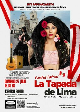 En estas "Fiesta Patrias del Perú" ven a nuestro espectáculo "La Tapada de Lima", musical de música criolla escrito por Nazareth Garcia Jaksetic. Interpretado por Bye Papi Nazareth artista peruana de la música y la danza, quién a grabado con el maestro Pepe Torres "La guitarra de oro del Perú", en la guitarra el maravilloso y magistral guitarrista Raúl Kiokio, en el bajo Mario Díaz Carralón y en la percusión, cajón peruano Ale Bonilla